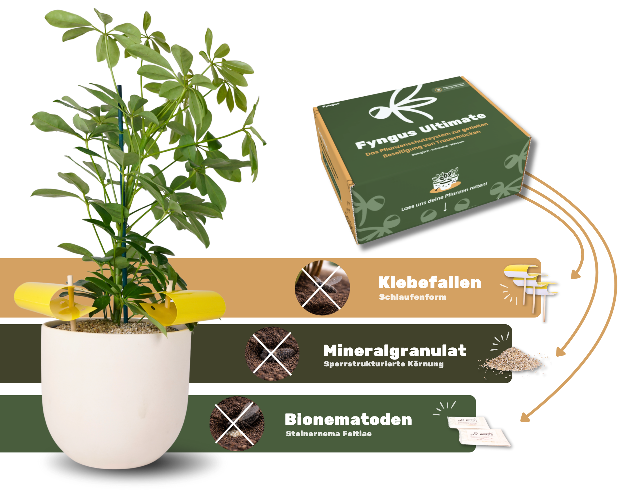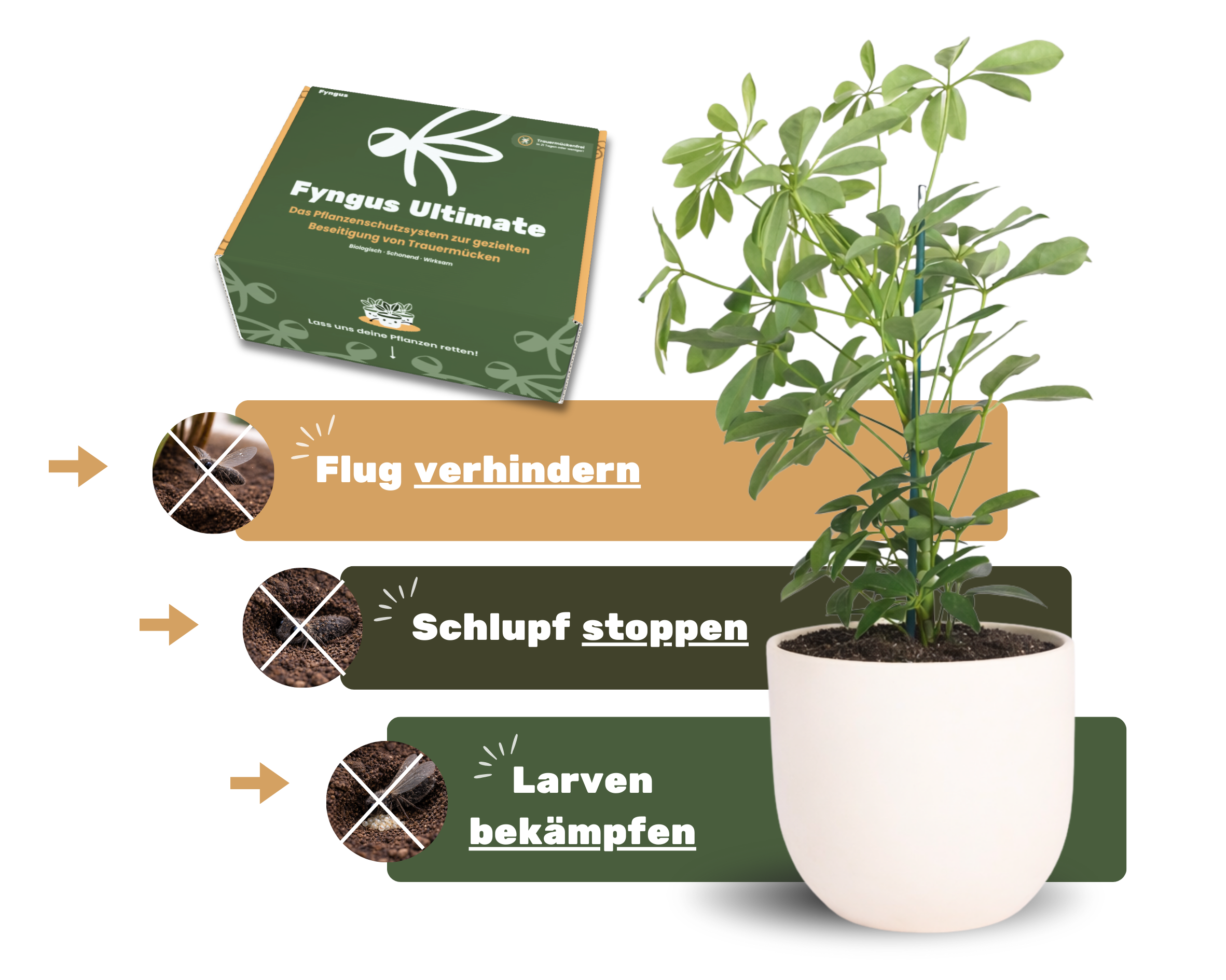 ⛔🦟🪴 Fyngus Ultimate ist ein biologisches System, das den gesamten Lebenszyklus von Trauermücken bei Zimmerpflanzen unterbricht.
